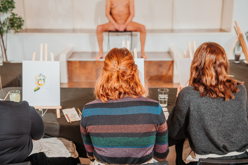 Je wordt eerst ontvangen met een welkomstdrankje. Vervolgens krijg je uitleg over de verf en tekentechnieken. Daarna is het eindelijk zo ver en komt het naaktmodel.
